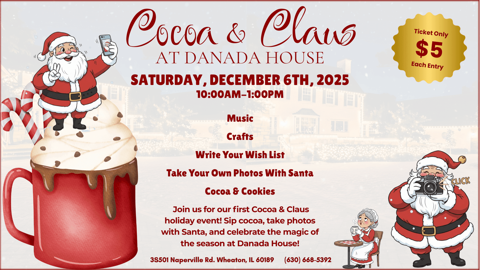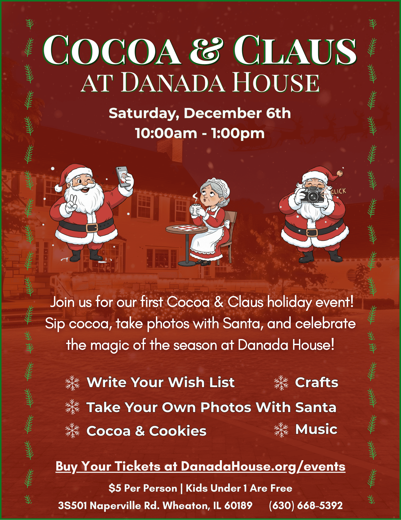 Please bring your own camera or phone for photos with Santa. Strollers are welcome, but some areas of the house have narrow walkways. If severe weather requires any changes, we will contact ticket holders by email. For questions about accessibility or special needs, call (630) 668-5392 or email danadahouse@gmail.com